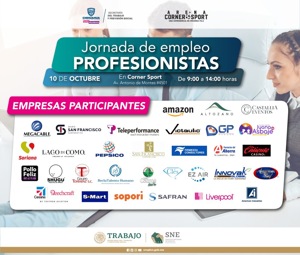 Gobierno del Estado, a través de la Secretaría del Trabajo y Previsión Social (STPS) y del Servicio Estatal de Empleo Chihuahua, invitan a participar este próximo lunes 10 de octubre en la Jornada de Reclutamiento para Profesionistas, a realizarse de las 09:00 a las 14:00 horas en la Arena de Eventos Corner Sport, de avenida Antonio de Montes #4501 en Chihuahua capital.