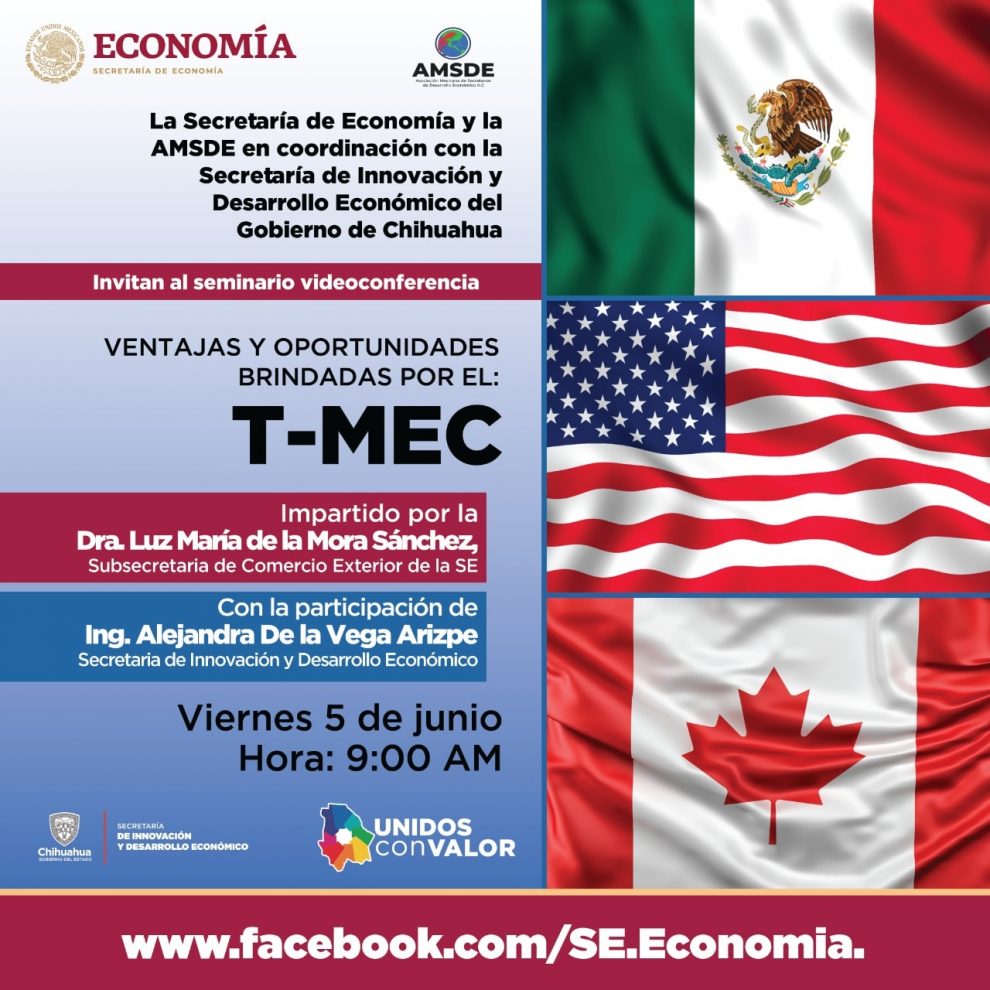 La Secretaría de Economía y la Asociación Mexicana de Secretarios de Desarrollo Económico A.C. (AMSDE), en coordinación con la Secretaría de Innovación y Desarrollo Económico (SIDE) del Gobierno del Chihuahua, invitan a la ciudadanía al seminario: Ventajas y oportunidades brindadas por el T-MEC.