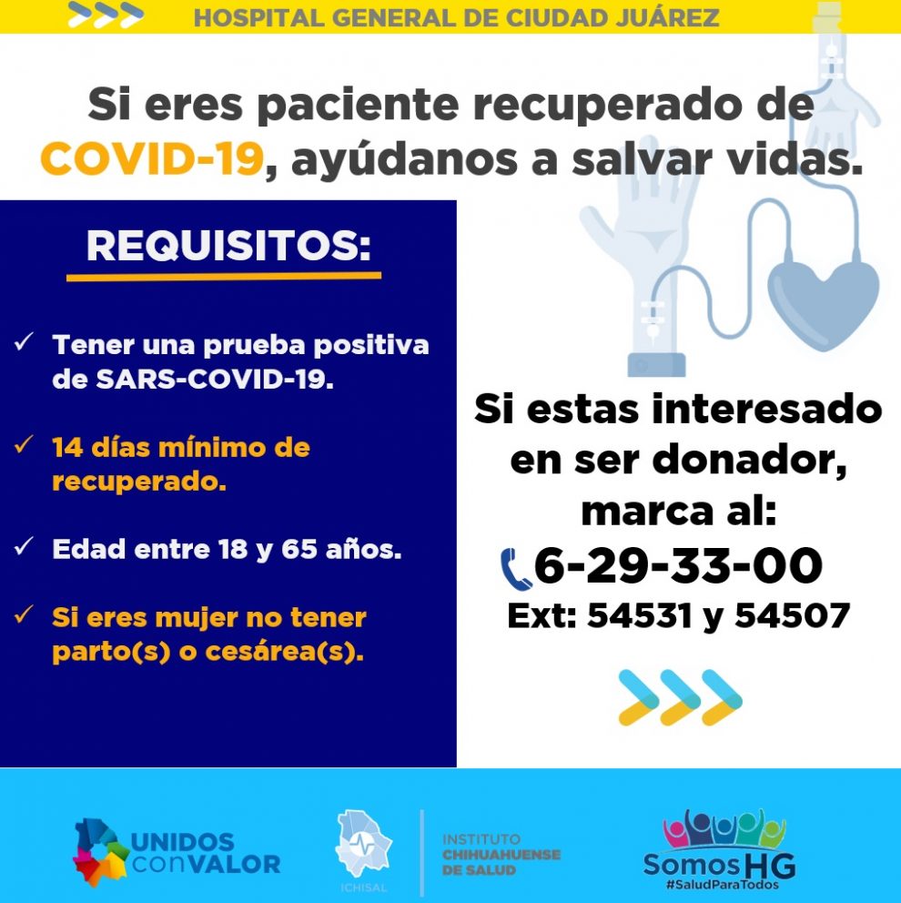 Son candidatos a donar plasma quienes tengan una prueba positiva de COVID-19, tengan un mínimo de 14 días de estar recuperados, con edad de entre 18 y 65 años y en el caso de las mujeres no tener partos o cesáreas.