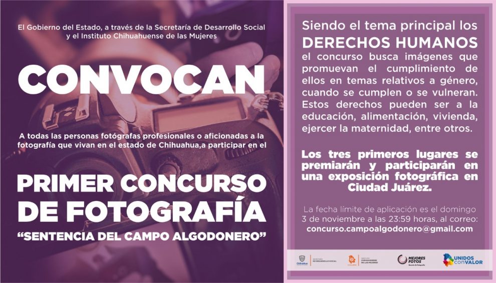 El Gobierno del Estado, a través de la Secretaría de Desarrollo Social y el Instituto Chihuahuense de las Mujeres, convoca a todas las personas fotógrafas profesionales o aficionadas que vivan en el estado de Chihuahua, a participar en