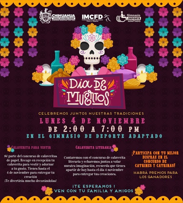 El Gobierno Municipal de Chihuahua celebrará de nueva cuenta una de las principales tradiciones que caracteriza a los mexicanos, que en colaboración con el Instituto Municipal de Cultura Física y Deporte a través de usuarios y personal de Gimnasio de Deporte Adaptado celebrarán el Día de Muertos.