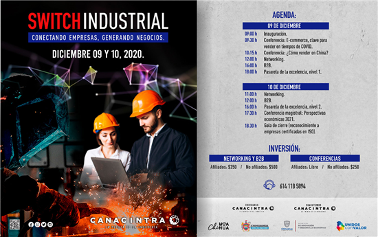 La Cámara Nacional de la Industria de la Transformación (CANACINTRA Chihuahua), con apoyo del Gobierno Municipal de Chihuahua y otras instancias gubernamentales de distintas ciudades del estado, invita a las micro, pequeñas y medianas empresas a participar en el evento Switch Industrial “Conectando empresas, generando negocios”. Este evento se llevará a cabo los días 9 y 10 de diciembre, de forma virtual, con el fin de generar encuentros de negocios entre las diferentes empresas de la entidad.