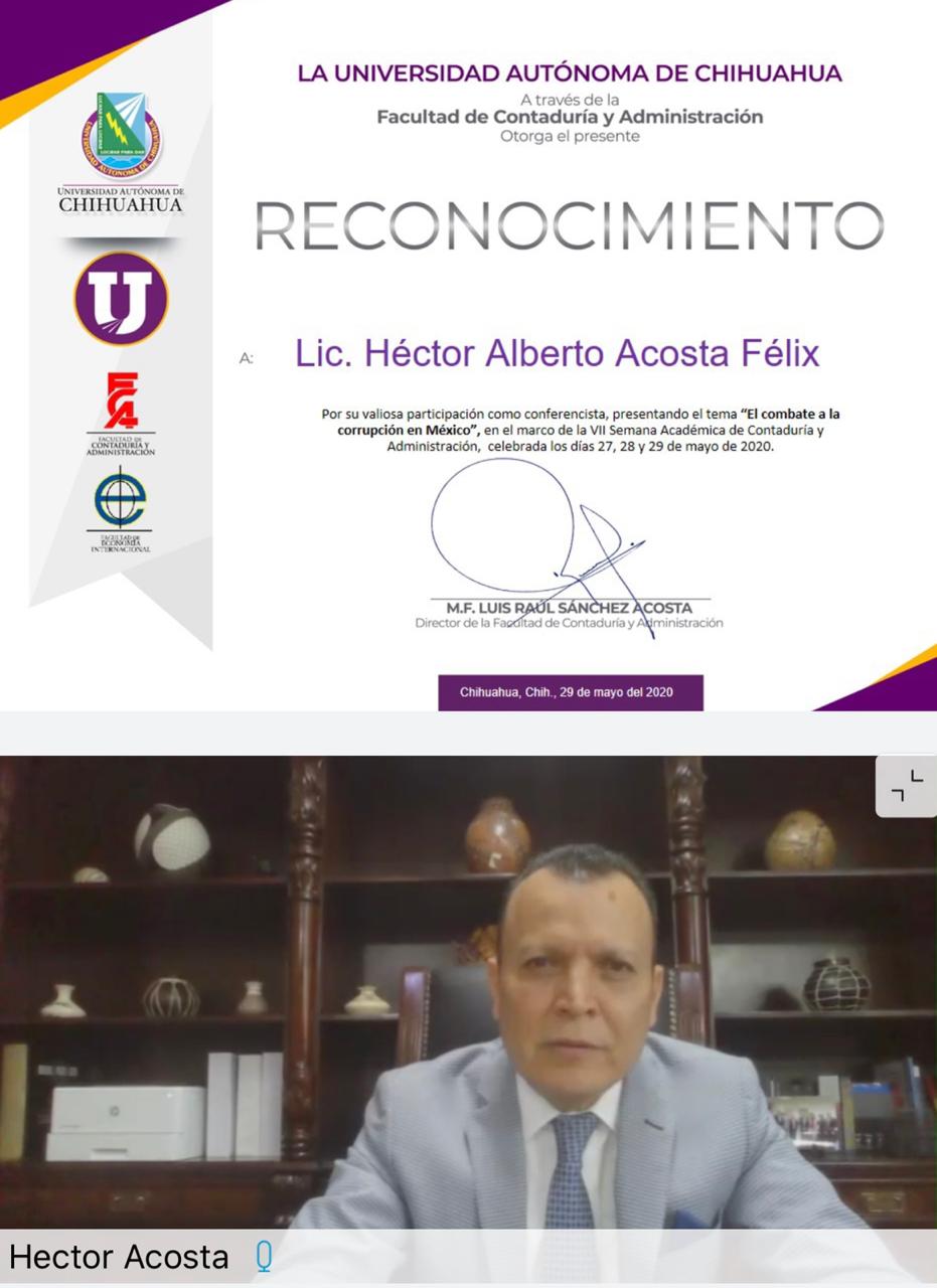 Ante unos 350 estudiantes, académicos y profesionistas en el ramo, el Auditor Superior del Estado, Héctor Alberto Aosta Félix impartió la plática virtual “El Combate a la Corrupción en México”, dentro de la VII Semana Académica de la Facultad de Contaduría y Administración de la Universidad Autónoma de Chihuahua (UACH).
