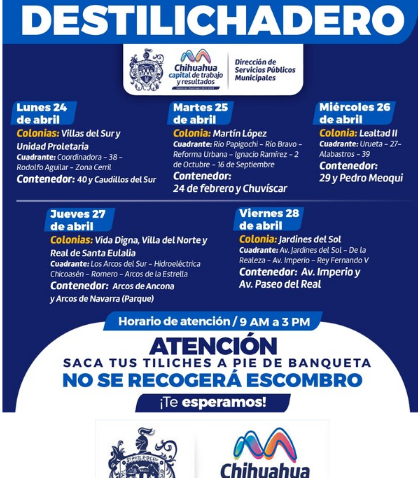 El Gobierno Municipal de Chihuahua, que encabeza el alcalde Marco Bonilla, a través de la Dirección de Servicios Públicos Municipales, informa a la ciudadanía el calendario del programa Destilichadero que se realizará del 24 al 28 de abril en ocho colonias de Chihuahua Capital.