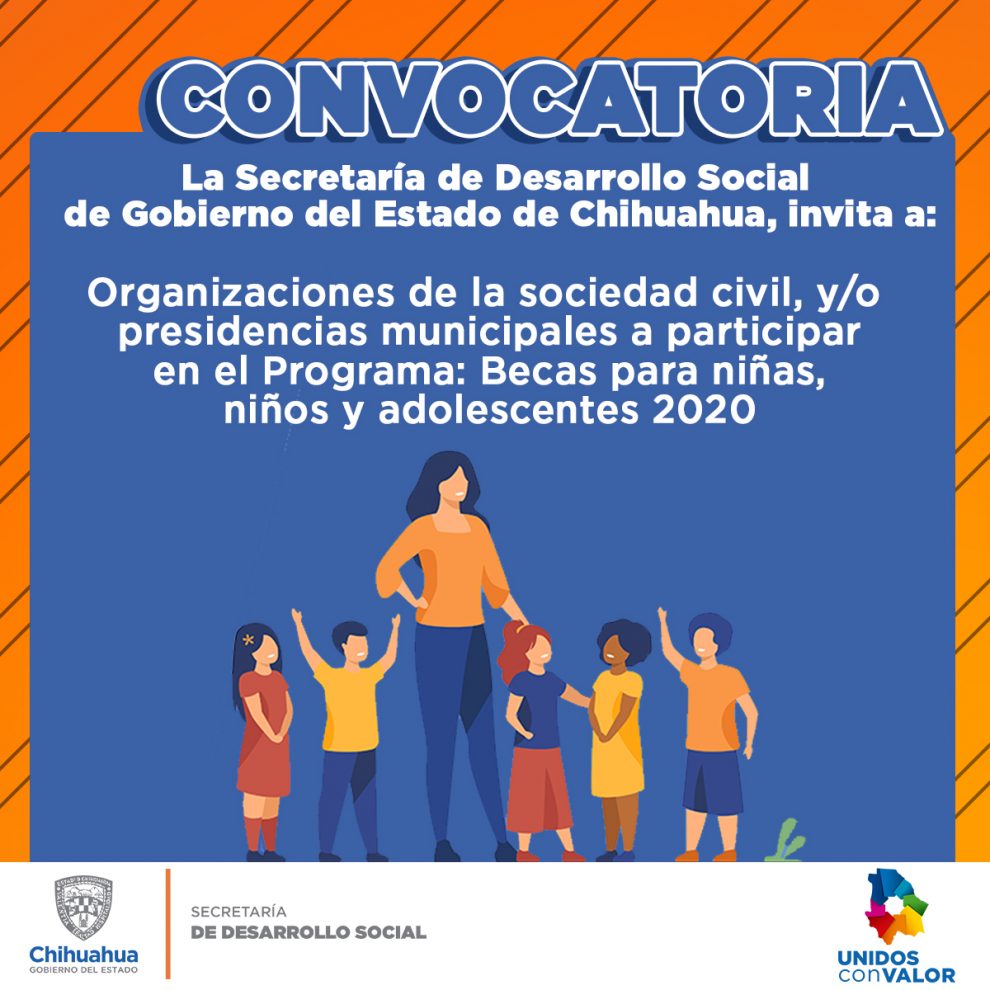 La Secretaría de Desarrollo Social del Gobierno del Estado emitió la convocatoria Chihuahua Crece Contigo: Becas para Niñas, Niños y Adolescentes 2020, dirigida a organizaciones de la sociedad civil (OSC) y/o municipios del Estado de Chihuahua, con excepción de Juárez, Ahumada, Guadalupe y Praxedis G. Guerrero, dio a conocer el secretario de Desarrollo Social, Luis Aguilar Lozoya.