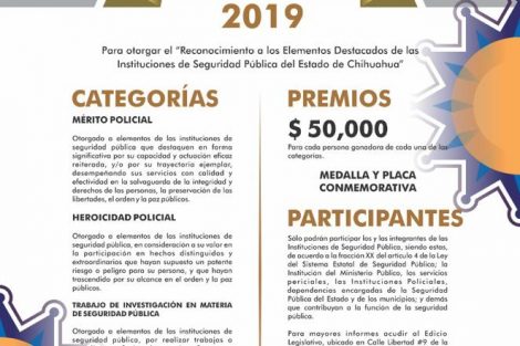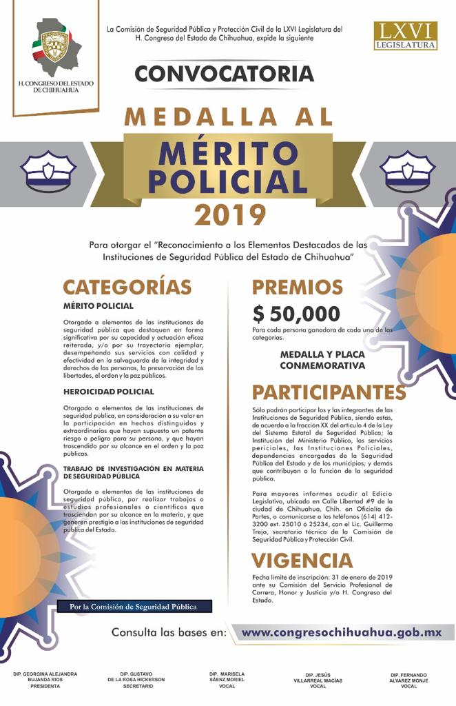 La diputada presidenta de la Comisión de Seguridad Pública, Geo Bujanda, dio a conocer la convocatoria a la “Medalla al mérito policial 2019”, que está dividida en tres categorías: Mérito policial, heroicidad policial y trabajo de investigación en materia de seguridad pública. Cada uno de los ganadores recibirá una medalla y placa conmemorativa así mismo un premio de $50,000 pesos para cada persona ganadora de cada una de las categorías.