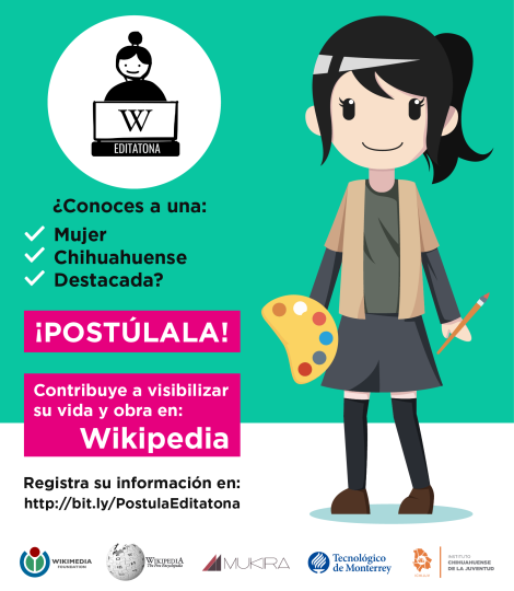 El Instituto Chihuahuense de la Juventud y la asociación civil Mukira lanzan conjuntamente una convocatoria para que mujeres de las universidades locales y de las Organizaciones de la Sociedad Civil participen en la primera “Editatona de Mujeres Chihuahuenses”, para escribir en Wikipedia artículos sobre las más destacadas.