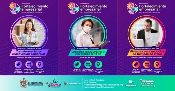Para información de horarios, costos y registro, el teléfono es 614 247 6880, o bien, el correo electrónico capacitacion@coparmexchihuahua.org