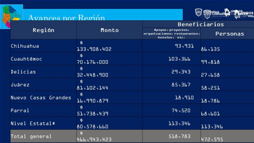 El gobernador Javier Corral informó que a la fecha se dispersaron 466 millones 943 mil 423 pesos en 518 mil 783 acciones de apoyo directo a proyectos, organizaciones, restaurantes, hoteles, entre otros, en beneficio de 472 mil 595 personas pertenecientes a las seis regiones en las que se