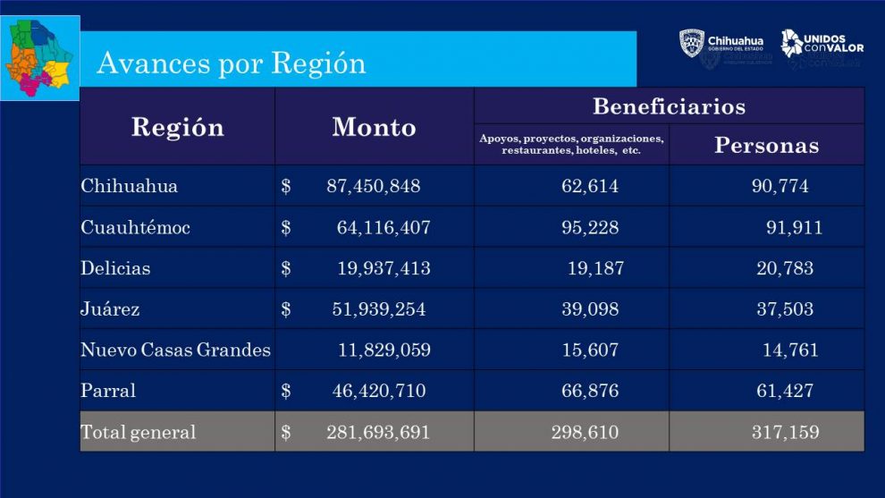 Un total de 281 millones 693 mil 691 pesos en 298 mil 610 acciones de apoyo directo a proyectos, organizaciones, restaurantes y hoteles, en beneficio de 317 mil 159 personas, se han invertido en las seis regiones en las que se dividió la entidad: Chihuahua, Juárez, Delicias, Cuauhtémoc, Parral y Nuevo Casas Grandes, informó el gobernador Javier Corral.