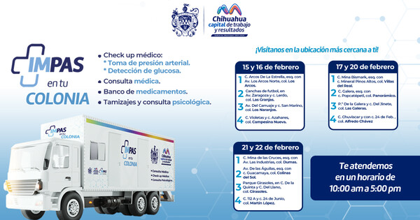 Chihuahua, Chih., a 11 de febrero de 2023.- El Gobierno Municipal de Chihuahua, a través del Instituto Municipal de Prevención y Atención a la Salud (IMPAS), invita a las familias de la Capital a aprovechar los servicios gratuitos en los Consultorios Móviles del