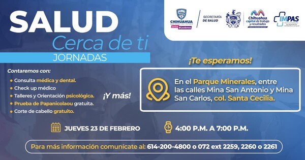 El Gobierno Municipal de Chihuahua, a través del Instituto Municipal de Prevención y Atención a la Salud (IMPAS), invita a las y los vecinos de la colonia Santa Cecilia a asistir a la jornada “Salud Cerca de Ti”, este próximo jueves 23 de febrero de las 16:00 a las 19:00 horas, en el Parque Minerales ubicado entre las calles Mina San Antonio y Mina San Carlos.