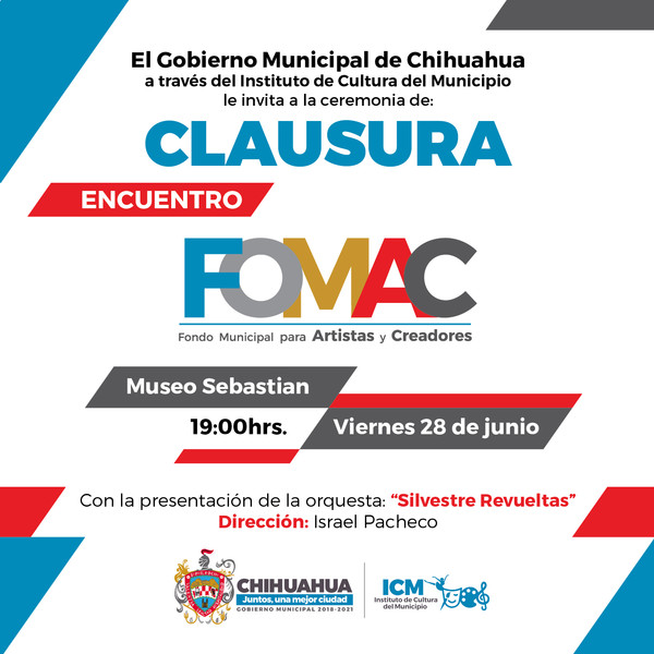 El Gobierno Municipal a través del Instituto de Cultura del Municipio invita a la Clausura del “Encuentro FOMAC”, programa de actividades en el que los beneficiarios de la primera emisión del Fondo Municipal para Artistas y Creadores, han ido presentando uno a uno el resultado de sus proyectos, y que concluirá con una obra musical de orquesta dirigida por el beneficiario Israel Pacheco, mañana viernes 28 de junio a partir de las 7 de la noche en las instalaciones de Museo Sebastian.