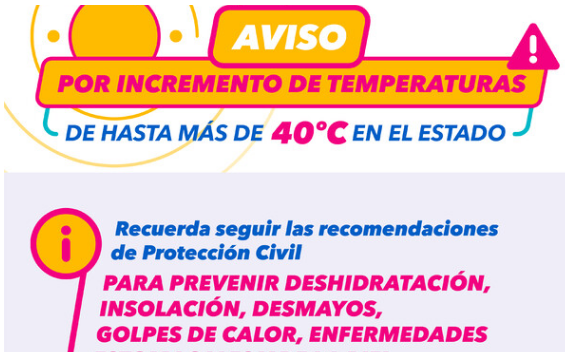 La Coordinación Estatal de Protección Civil (CEPC) emite una alerta preventiva ante el incremento de temperaturas, que oscilará desde los 28 hasta los 41 grados centígrados en las diversas regiones del estado a partir de este inicio de semana.