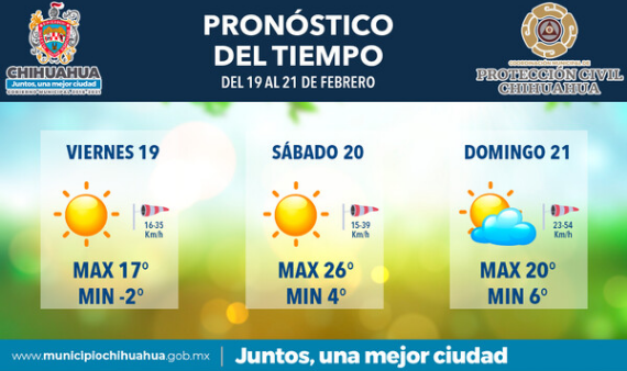 La encargada del despacho de la dependencia municipal, Bianca Luz Nevárez Moreno, informó que para hoy 19 de febrero se pronostica que la máxima sea de 17°C durante el día con cielos parcialmente despejados, y la mínima llegue hasta los -2 grados Celsius.