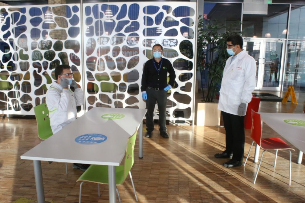 En el video transmitido en Chihuahua Adelante se mostró cómo, en la cafetería cada mesa puede ser usada solamente por dos personas. La colocación de las sillas garantiza que no estén de frente.