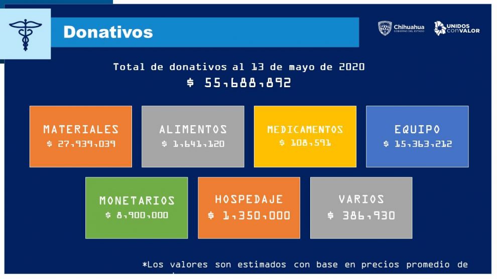 El gobernador del Estado, Javier Corral Jurado, agradeció la generosidad de la sociedad chihuahuense, que ha aportado a la fecha 55 millones 688 mil 892 pesos en material, alimentos, medicamentos, equipo, recursos monetarios, hospedaje y otros, como donativo para contribuir en el combate a la contingencia sanitaria COVID-19.