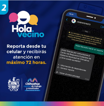 En el caso de Hola Vecino, solo es necesario mandar un mensaje al teléfono 614-101-5072, a través de la aplicación WhatsApp, en donde se les indicarán los pasos para obtener la información que solicitan o realizar un reporte.