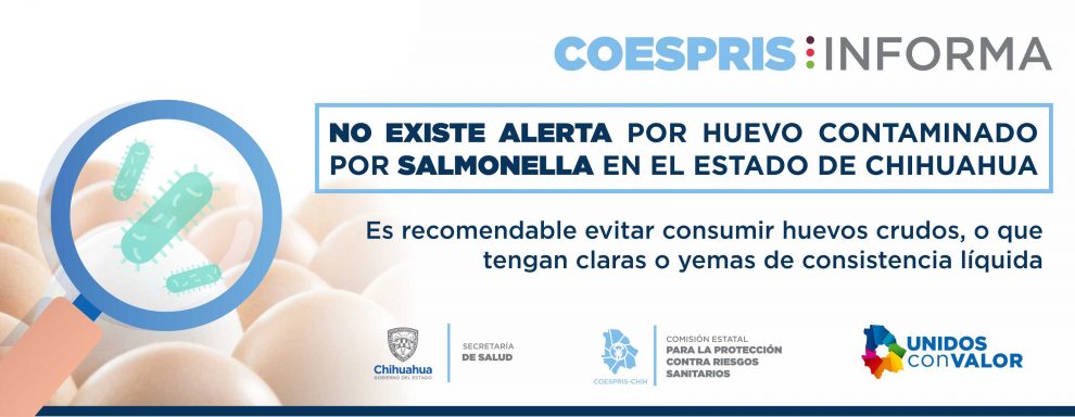 La Comisión Estatal para la Protección Contra Riesgos Sanitarios (Coespris), informa que no existe ninguna alerta sanitaria vigente por la existencia de huevo contaminado con Salmonella en el Estado de Chihuahua.