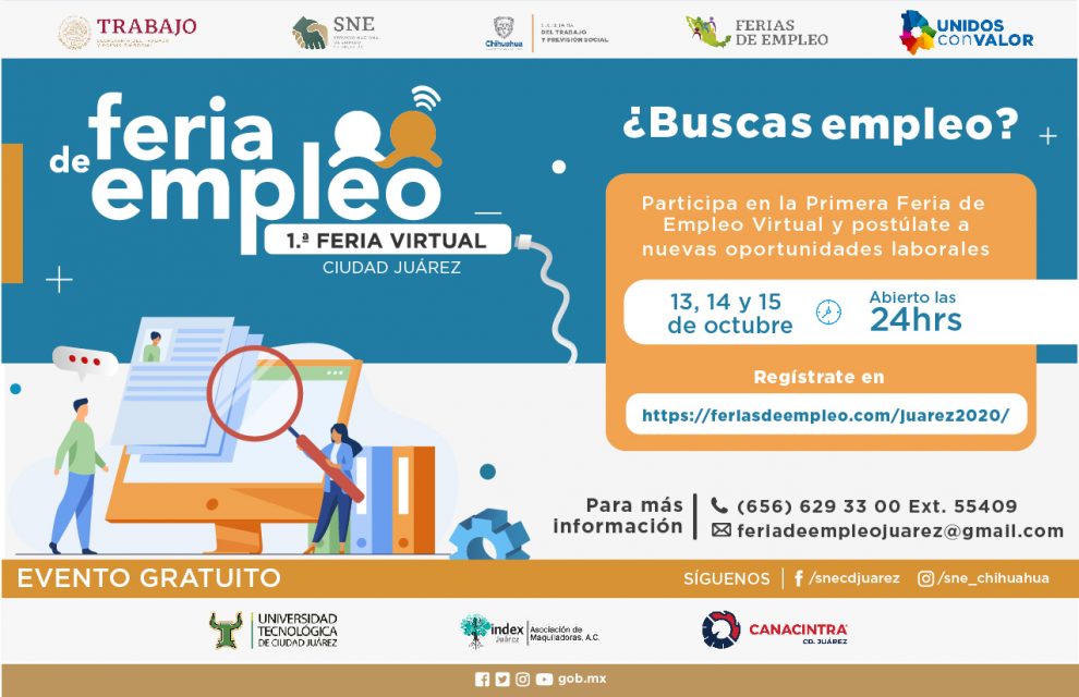 La Primera Feria de Empleo Virtual de Ciudad Juárez es totalmente gratuita a través del sitio web www.feriasdeempleo.com/juarez2020. Para mayor información, se pone a disposición la línea telefónica 656 629 33 00 extensión 55409.