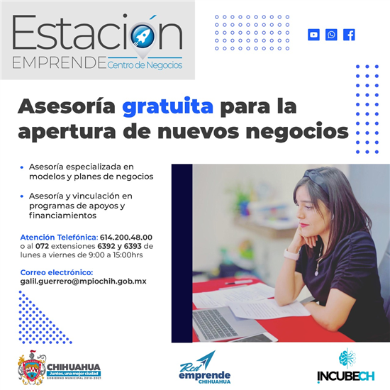 El Gobierno Municipal de Chihuahua, a través de la Dirección de Desarrollo Económico y Turístico, ofrece asesorías personalizadas a distancia a las personas interesadas en poner su propio negocio. Esta atención forma parte de los servicios que brinda el Municipio, a través del Centro de Negocios Estación Emprende, el cual está cerrado físicamente por la contingencia sanitara del COVID-19.