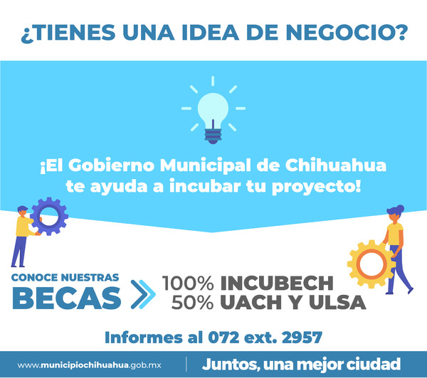 Proximamente se contempla la apertura de la nueva Incubadora de Empresas del Municipio de Chihuahua INCUBECH, la cual brindará becas del 100 por ciento a los interesados. Para más información acércate a la Dirección de Desarrollo Económico y Turístico, ubicada en la Quinta Touché, en avenida Independencia y Simón Bolívar o comunícate al 2 00 4800, extensión 2957.
