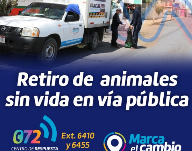 Pueden solicitar el servicio o reportar animales sin vida en las calles, pueden comunicarse al 072, extensiones 6410 y 6455, así como la aplicación telefónica Marca el Cambio.