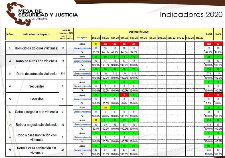 La Comisión de Indicadores de la Mesa de Seguridad y Justicia de la ciudad de Chihuahua dio a conocer la incidencia delictiva correspondiente a mayo de 2020, facilitando información a los medios de comunicación sobre los nueve indicadores presentados mes a mes, así como de los delitos de violencia familiar y privación ilegal de la libertad, todos estos con base en el análisis realizado por el