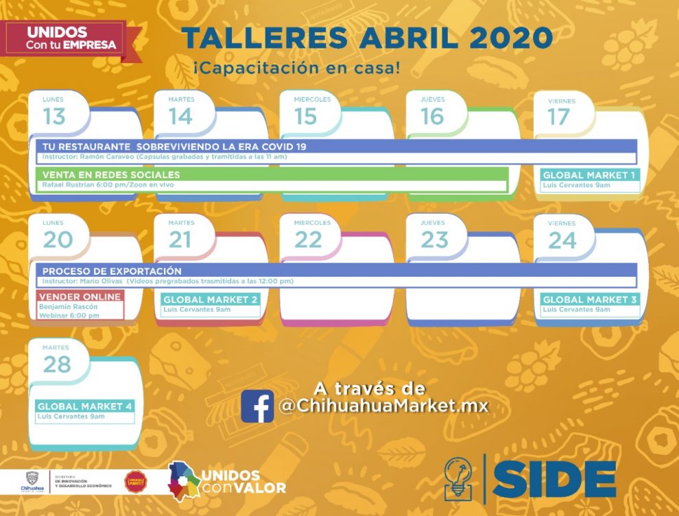 Como parte de las acciones implementadas por el Gobierno del Estado para hacer frente a la crisis económica por la contingencia del COVID-19, la Secretaría de Innovación y Desarrollo Económico (SIDE), invita a las capacitaciones y asesorías que se brindan durante el mes de abril en forma virtual y gratuita.