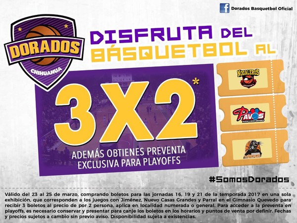 El Club Dorados de Chihuahua da a conocer a la afición chihuahuense la promoción de 3×2 para el cierre de la temporada regular de la Liga de Basquetbol Estatal.