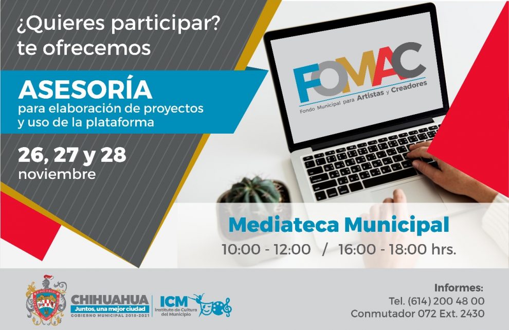 El Gobierno Municipal a través del Instituto de Cultura del Municipio, invita a todos los interesados en registrar sus proyectos en la segundaemisión del Fondo Municipal para Artistas y Creadores (FOMAC), a las asesorías que se llevarán a cabo los días 26, 27 y 28 de noviembre, con la intensión de aclarar dudas sobre cómo deben elaborarse los proyectos y cómo utilizar la plataforma digital.