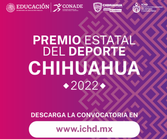 Gobierno del Estado, a través del Instituto Chihuahuense del Deporte y Cultura Física (ICHD), convoca a las asociaciones deportivas a inscribir a las y los deportistas y entrenadores que hayan destacado por sus logros en el periodo comprendido del 11 de octubre de 2021 al 11 de octubre del presente año y que puedan contender en la trigésima primera edición del Premio Estatal del Deporte 2022.