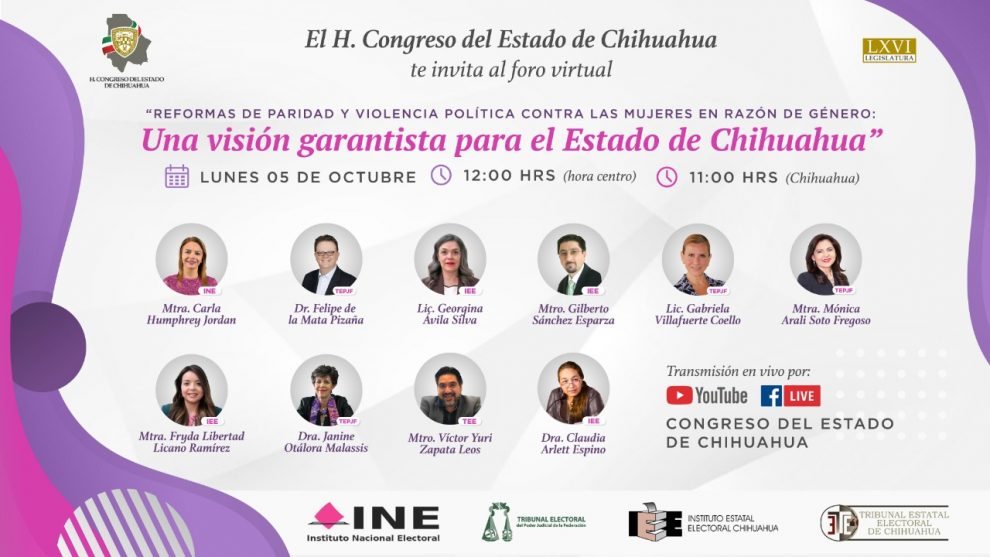 El Congreso del Estado de Chihuahua en conjunto con el Instituto Nacional Electoral, el Tribunal Electoral del Poder Judicial de la Federación, el Instituto Estatal Electoral y el Tribunal Estatal Electoral de Chihuahua, te invitan a participar en el Foro Virtual “Reformas de Paridad y Violencia Política Contra las Mujeres en Razón de Género: Una Visión Garantista para Chihuahua”.