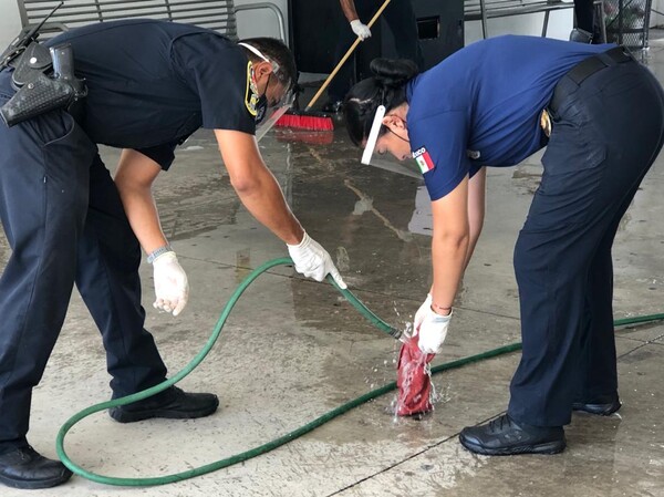 Como ya lo han realizado anteriormente en diferentes lugares de la ciudad, elementos de la Policía Municipal efectuaron labores de limpieza y sanitización en áreas comunes ubicadas al exterior del Hospital Infantil de Chihuahua, como una forma de contribuir a prevenir la propagaciones del virus COVID-19 entre la comunidad.