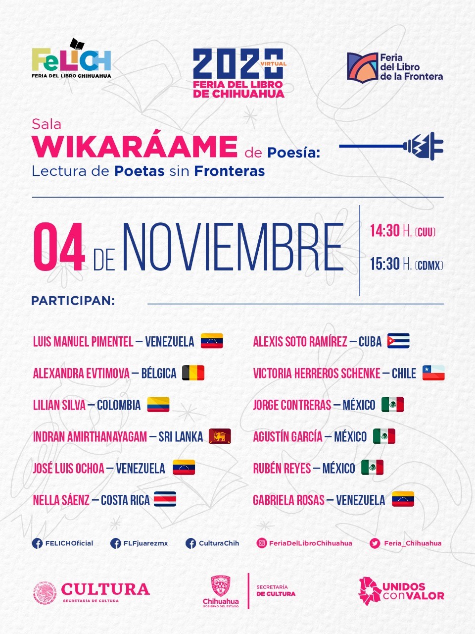 – Escritoras y escritores de Venezuela, Cuba, Bélgica, Chile, Colombia, Costa Rica, Sri Lanka y México, se reúnen virtualmente en este encuentro literario, el miércoles 4 de noviembre a las 4:30 de la tarde, hora de Chihuahua, a través de Facebook