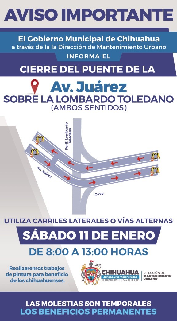 El Gobierno Municipal, a través de la Dirección de Mantenimiento Urbano, informa a la ciudadanía del cierre total en el puente ubicado en la avenida Juárez y periférico Lombardo Toledano, el próximo sábado 11 de enero.