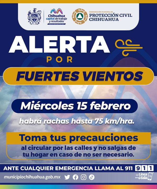 El Gobierno Municipal de Chihuahua exhorta a la población a extremar precauciones, ya que se esperan fuertes vientos esta semana en la ciudad, con rachas que podrían alcanzar los 75 kilómetros por hora, pronóstico que se considera de riesgo.