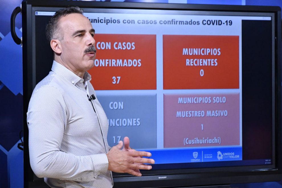 Del total de confirmados: 1,672 Juárez, 649 Chihuahua, 6 Bachíniva, 28 Cuauhtémoc, 18 Ojinaga, 3 Namiquipa, 38 Meoqui, 1 Julimes, 5 Camargo, 2 Saucillo, 4 Ahumada, 2 n Guadalupe D.B., 13 Guachochi, 51 Delicias, 5 Ascensión, 1 Guerrero, 3 Bocoyna, 4 Madera, 82 Parral, 3 Buenaventura, 1 Temósachi, 1 Galeana, 3 Guadalupe y Calvo, 21 Nuevo Casas Grandes, 2 Rosales, 4 Jiménez, 2 Aldama, 1 Santa Bárbara, 2 Ignacio Zaragoza, 1 López, 5 Urique, 2 Janos, 1 San Francisco del Oro, 1 Guazapares, 3 Allende, 1 Coronado y 1 Valle de Zaragoza.