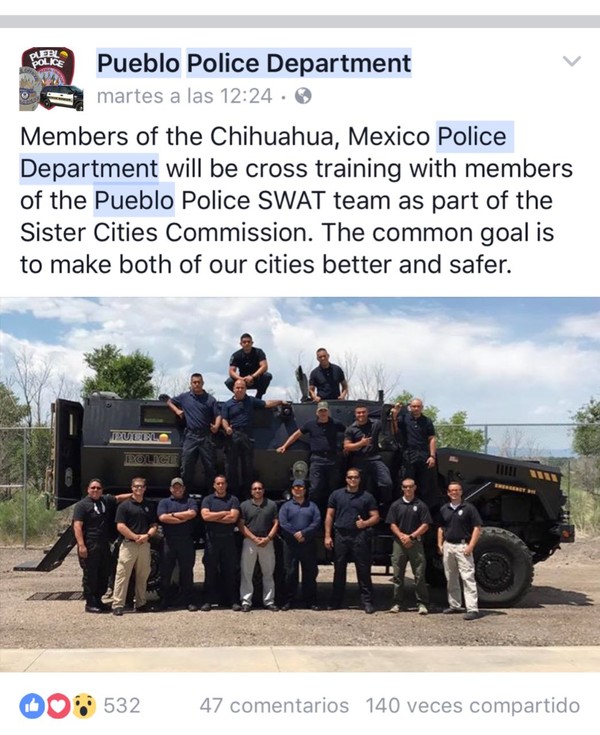 Un grupo de agentes de la Dirección de Seguridad Pública, regresó de la ciudad de Pueblo, Colorado, Estados Unidos, luego de cursar un entrenamiento en técnicas avanzadas tipo SWAT (Special Weapons and Tactics, o traducido, Armas y Tácticas Especiales) impartido por representantes del Departamento de Policía de aquél lugar como parte de los convenios internacional de apoyo bajo el concepto ”Ciudades Hermanas” que permite a la DSPM capacitar a elementos de Policía y Bomberos fuera del país.