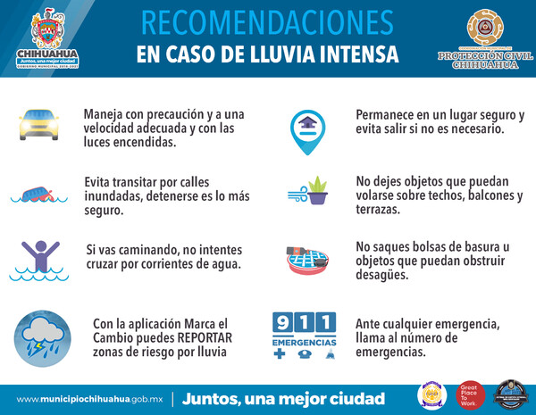 Joel Estrada Castillo, titular de la dependencia, informó que la tormenta se está originado en el Golfo de México y para el estado de Chihuahua se esperan fuertes vientos, tormentas eléctricas, lluvias e inundaciones, por lo que se exhorta a la población en general a no salir a la calle a menos de que sea una emergencia, pero en caso de hacerlo y viajar en automóvil evitar cruzar por lugares en los que la corriente sobrepase la mitad de la llanta, y de ninguna manera aventurarse a pasar de manera pedestre o en motocicleta por donde haya acumulaciones de agua.