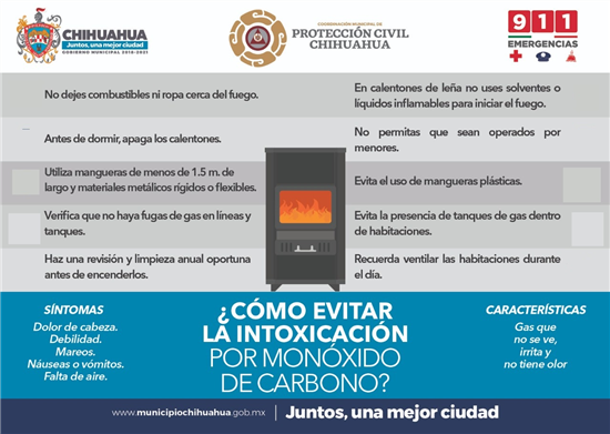 Ante el repentino descenso de temperatura que se presenta y habrá de continuar en la ciudad debido al frente frío número 18 y a la masa de aire polar que lo impulsa, la Coordinación Municipal de Protección Civil recomienda a los chihuahuenses tomar las medidas necesarias para evitar incidentes al interior de las viviendas relacionados con el manejo de calefactores.