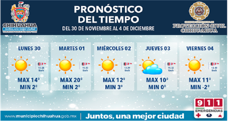 A pesar de que el lunes permanecerá mayormente soleado, la temperatura máxima será de 14 grados Celsius y la mínima de 2 grados; para el martes se espera un incremento de hasta 20 grados en la máxima, mientras que la mínima también será de 2°C; para el miércoles se espera un día soleado con temperatura máxima de 12 y mínima de 3 grados; para el jueves será de 10 y 0° C, respectivamente; mientras que el viernes será el día más frío, con 11 grados Celsius como máxima en el marcador del termómetro y -2 grados como mínima.