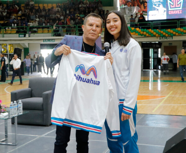 Chihuahua, Chih. A 16 de marzo de 2023.- El campeón mundial de boxeo, Julio César Chávez, recibió de manos de la deportista destacada Valeria Gutiérrez Lyncet, la chaqueta oficial de los Deportistas marca “Chihuahua Capital” durante la plática “El sueño de un Campeón”, impartida frente a cientos de estudiantes y deportistas en el gimnasio del Colegio de Bachilleres 1.