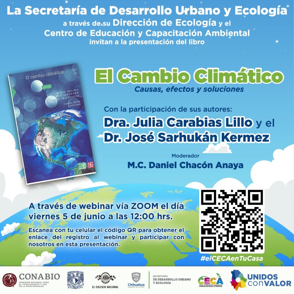 Para el viernes 05 de junio, se abre al público en general la presentación virtual del libro: El Cambio Climático: causas, efectos y soluciones, en donde se contará con la participación de sus autores, la Dra. Julia Carabias, y el Dr. José Sarukhán.