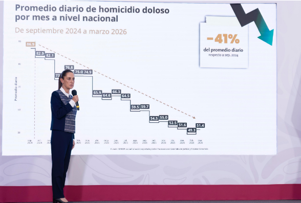 “En nuestro gobierno, con cifras preliminares a 2026, hemos reducido los homicidios dolosos del 2024, 91.7 al 2026 en 50.8 diarios, una reducción del 45 por ciento. Es decir, seguimos trabajando y hay que trabajar más, pero la Estrategia está dando resultados”, puntualizó en la conferencia matutina: “Las mañaneras del pueblo”.
