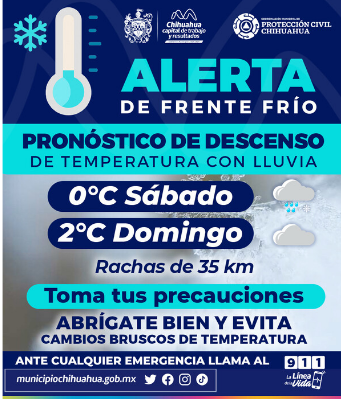 Chihuahua, Chih. A 17 de marzo de 2023.- La Coordinación Municipal de Protección Civil reitera a la población la alerta activa, por el descenso en las temperaturas para este sábado 17 y domingo 18 de marzo, así como exhorta a seguir las recomendaciones para evitar accidentes por lluvia y prevenir afectaciones a la salud.