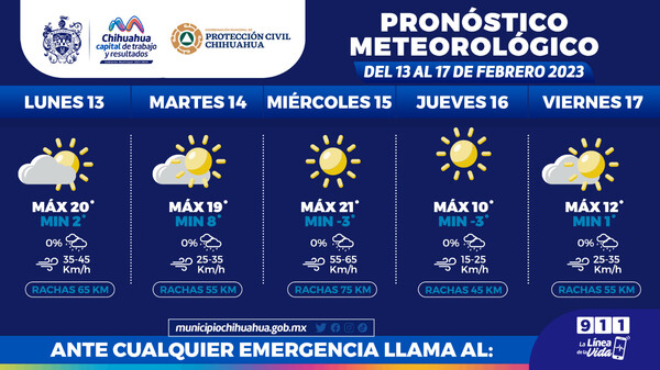 De acuerdo al pronóstico que emite el Servicio Meteorológico Nacional de CONAGUA, para este lunes 13 de febrero se espera una máxima de 20°C y una mínima de 2°C con vientos de 35 a 45 kilómetros por hora y rachas de hasta 65 kilómetros por hora, con un