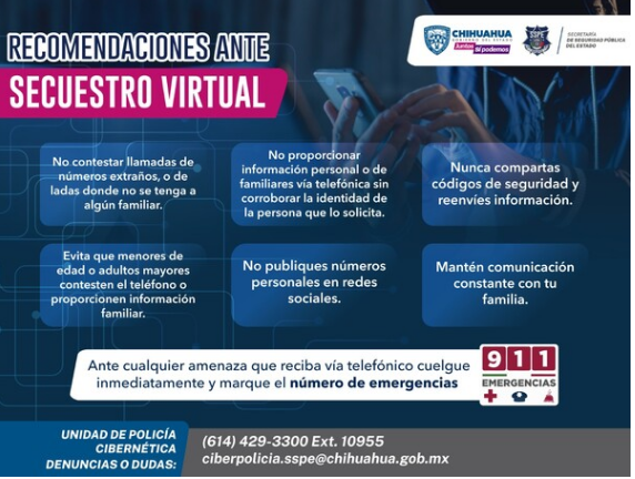 La SSPE dio a conocer que un secuestro virtual es una modalidad de extorsión telefónica mediante la cual, el delincuente realiza llamadas a ciertos números en forma aleatoria, en busca de una persona vulnerable, y una vez que identifica a su posible víctima, le solicita otro número telefónico de un familiar o persona de confianza, indicándole que es para continuar en contacto.