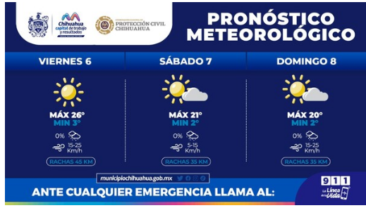 De acuerdo al pronóstico que emite el Servicio Meteorológico Nacional de CONAGUA, para este viernes se espera una máxima de 26°C y una mínima de 3°C con vientos de hasta 45 kilómetros por hora con un