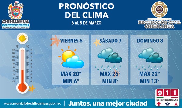 Para este viernes el pronóstico indica que la temperatura podrá alcanzar los 20° Celsius, en tanto el sábado podría elevarse hasta 21° C y el domingo llegará a los 26 grados centígrados, para el fin de semana se prevé registro de lluvias débiles.